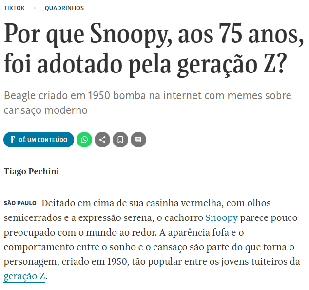 “Embora os personagens tenham surgido muito antes da internet, é nesse novo ambiente que eles vêm encontrando uma nova juventude. Apenas no TikTok brasileiro, Snoopy e companhia somam 450 mil seguidores. No Brasil, além da presença expressiva nas redes sociais, a marca conta com milhares de produtos licenciados em áreas que vão de vestuário a papelaria. ”